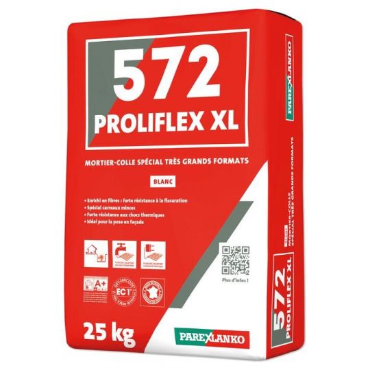 49,86 € TTC572 PROLIFLEX XL est un mortier-colle spécialement conçu pour la pose de carreaux de grands formats. Il offre des performances élevées d'adhérence et de déformabilité, adapté pour les sols intérieurs et extérieurs ainsi que les murs. Polyvalent, il convient également aux façades et aux planchers chauffants.
